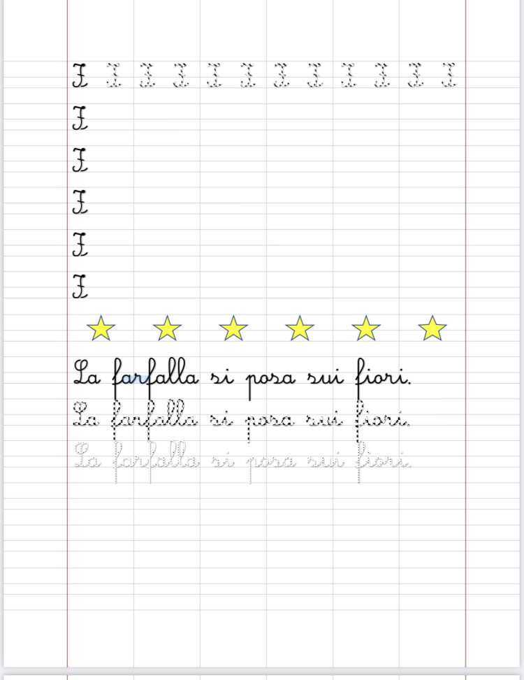 Si inizia con la scrittura in corsivo di una singola lettera per poi procedere alla scrittura in corsivo di parole per poi concludere con la scrittura di intere frasi con l’aiuto di un simpatico personaggio che lo accompagna in ogni pagina del libro.